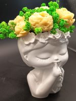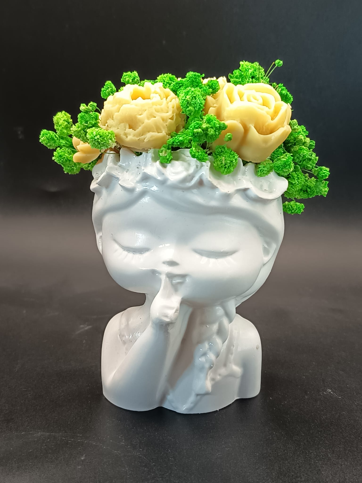 Fetița cu secret” este un decor delicat și plin de farmec, inspirat de inocența copilăriei și frumusețea lucrurilor nespuse. Cu un gest subtil și o expresie liniștită, bustul transmite o poveste tăcută, completată de un aranjament floral realizat manual din ceară naturală de soia.
