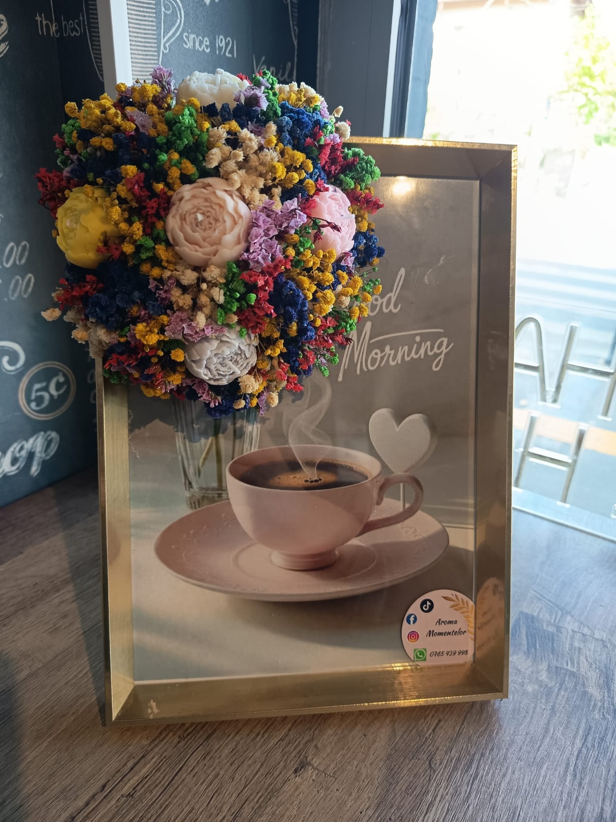 Tabloul îmbină armonios un fundal ilustrativ cu o ceașcă de cafea și un aranjament floral realizat manual din flori din ceară de soia și flori uscate naturale. Florile din ceară de soia sunt modelate cu grijă, oferind un aspect delicat și realist, iar florile uscate completează compoziția cu textură și naturalețe.