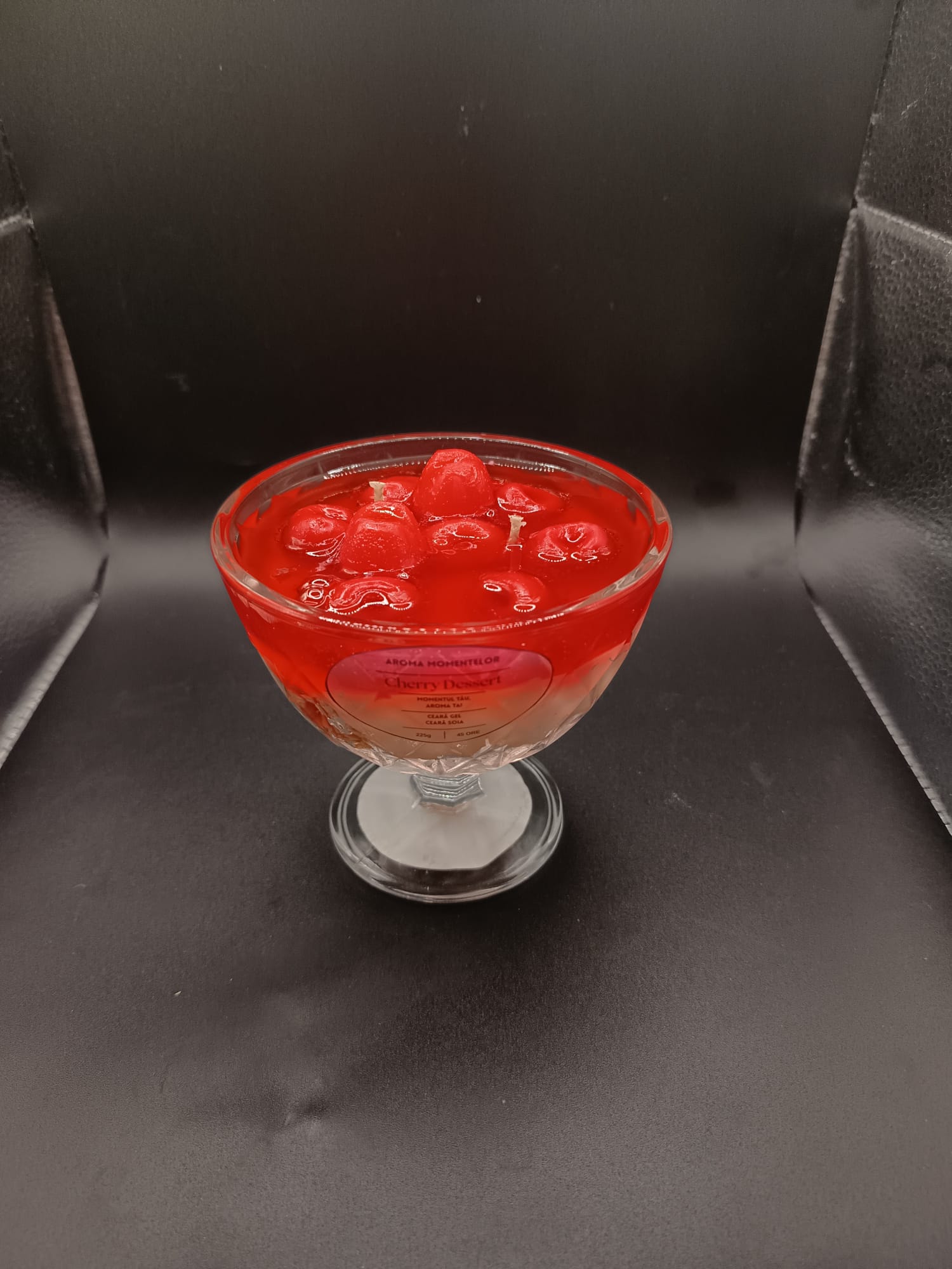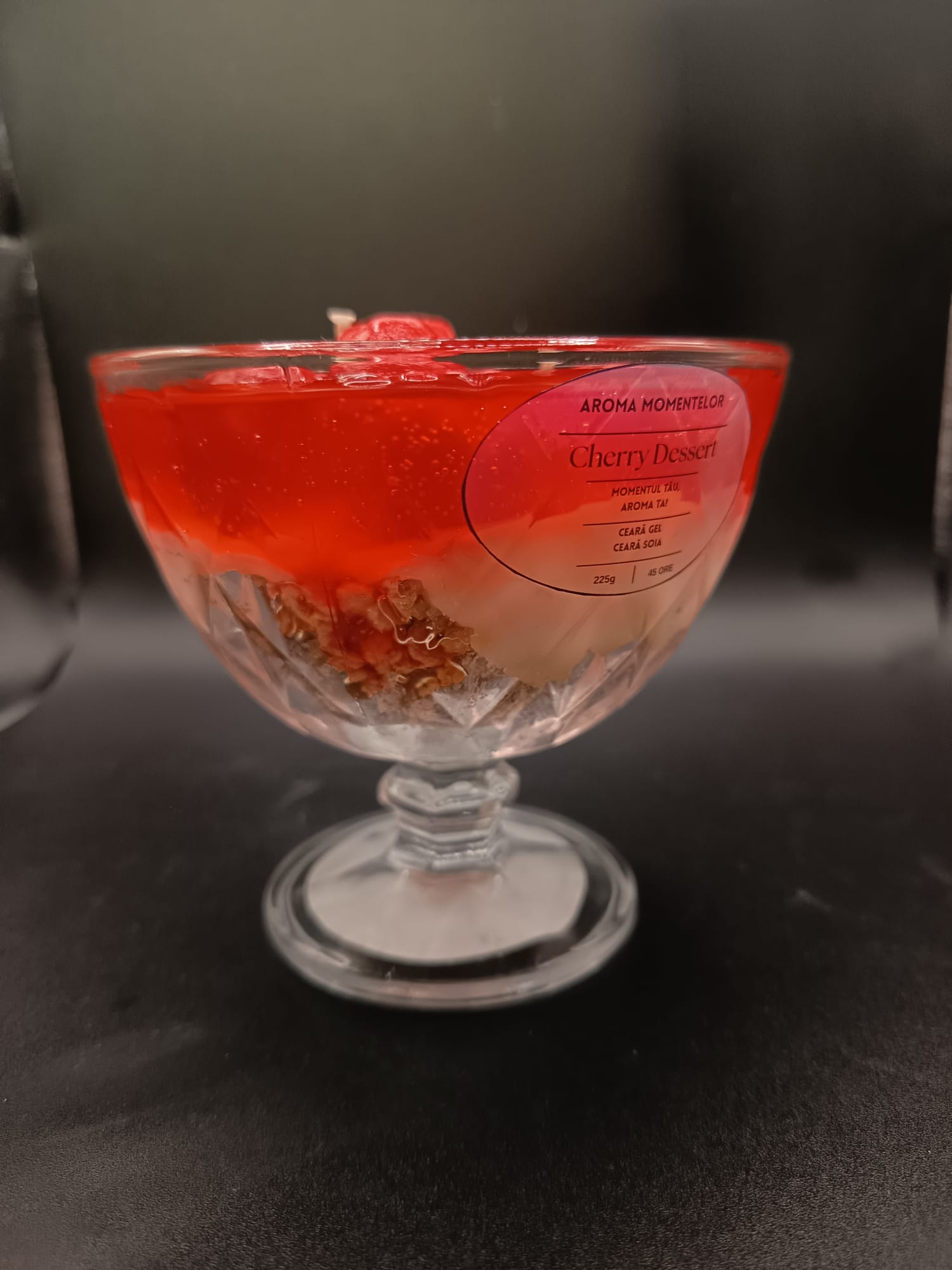 „Sweet Cherry – Desert Aromat” este o lumânare spectaculoasă, inspirată din deserturile fine cu cireșe. Realizată manual, în straturi care imită perfect un desert cremos cu topping de cireșe, această creație îmbină estetica rafinată cu parfumul delicat și plăcut.