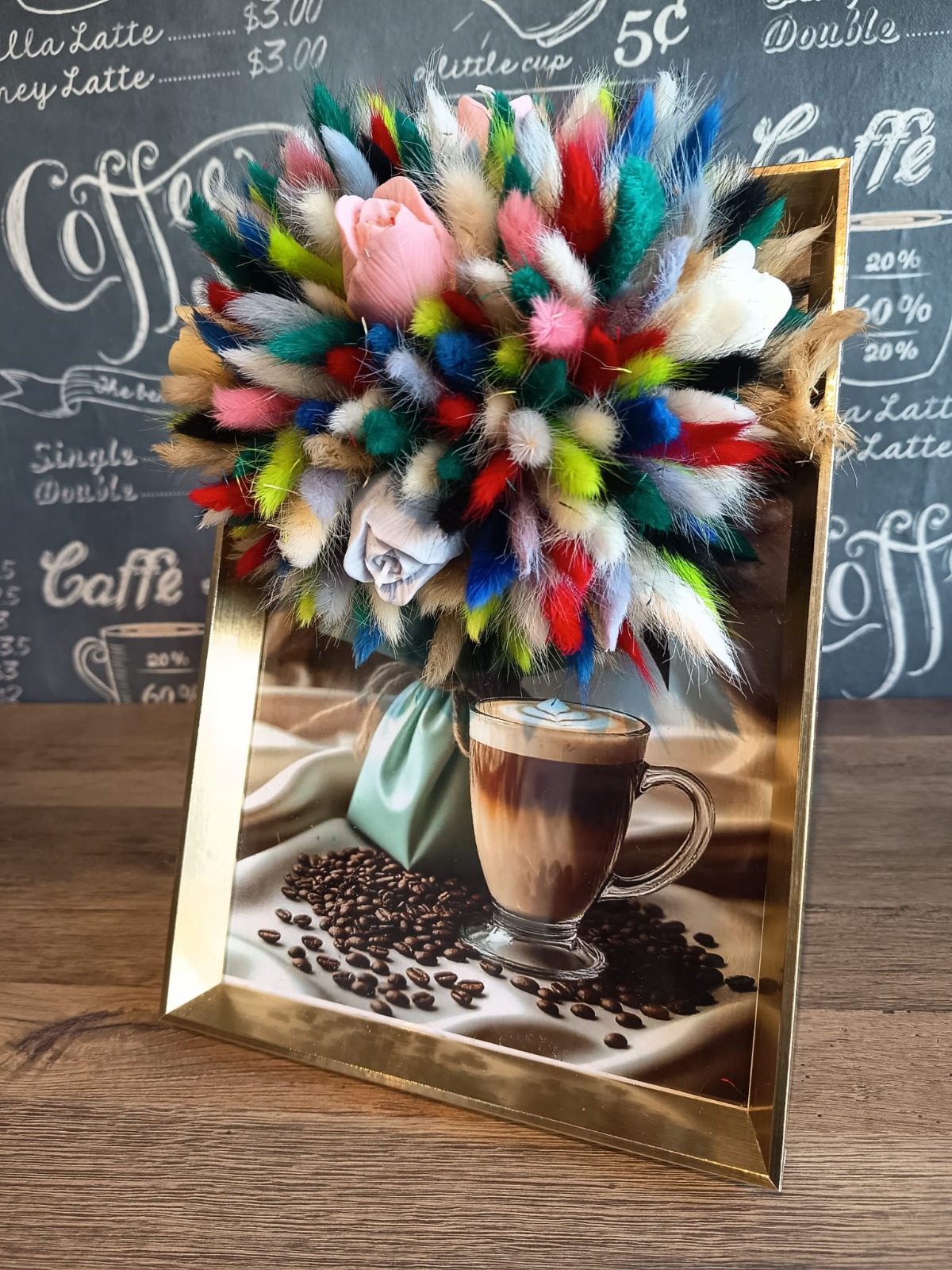 Urban Bloom este un tablou decorativ handmade ce îmbină armonios florile din ceară de soia cu flori uscate naturale, creând un contrast elegant între delicatețea elementelor florale și atmosfera modernă, urbană a fundalului.